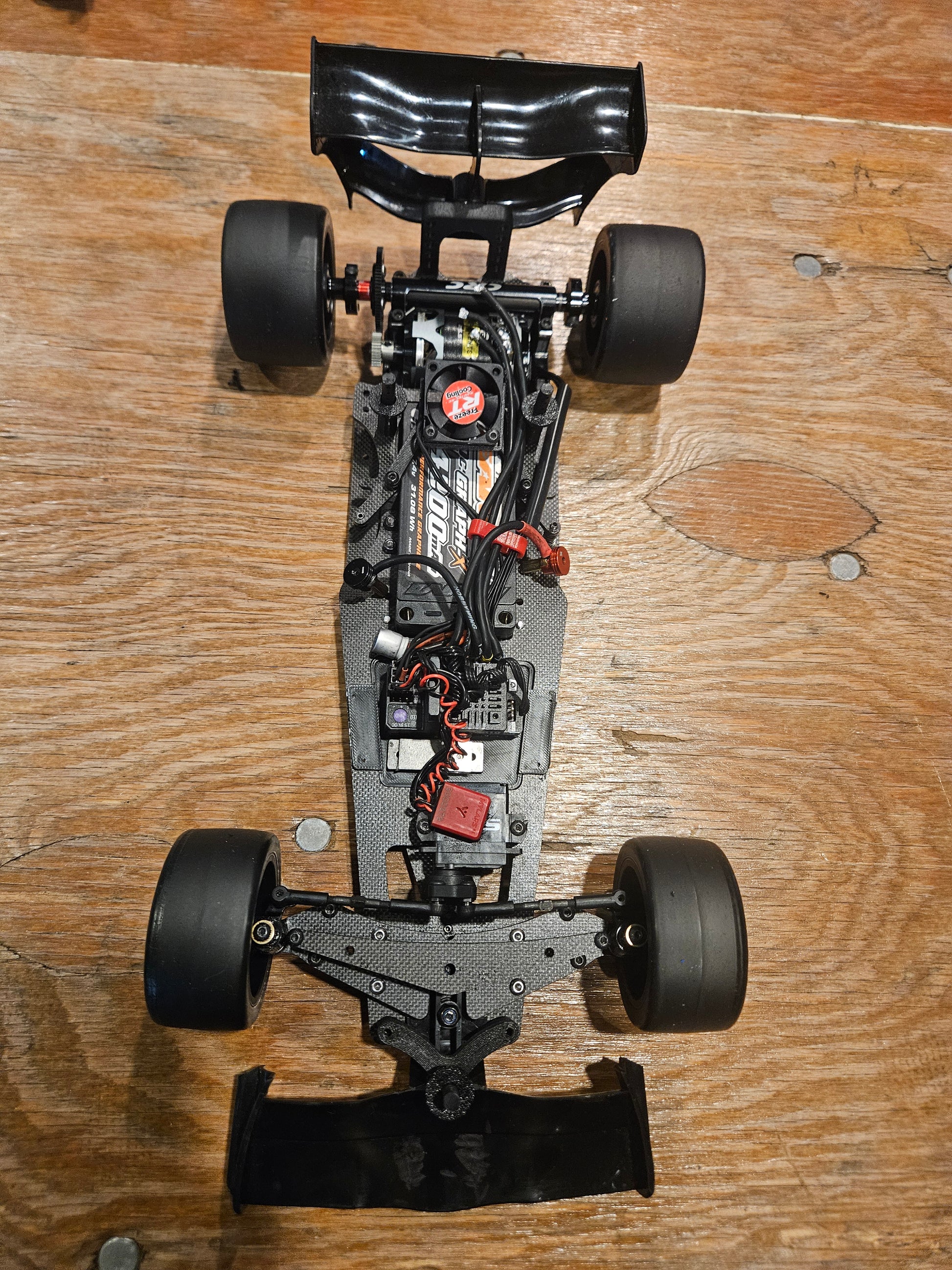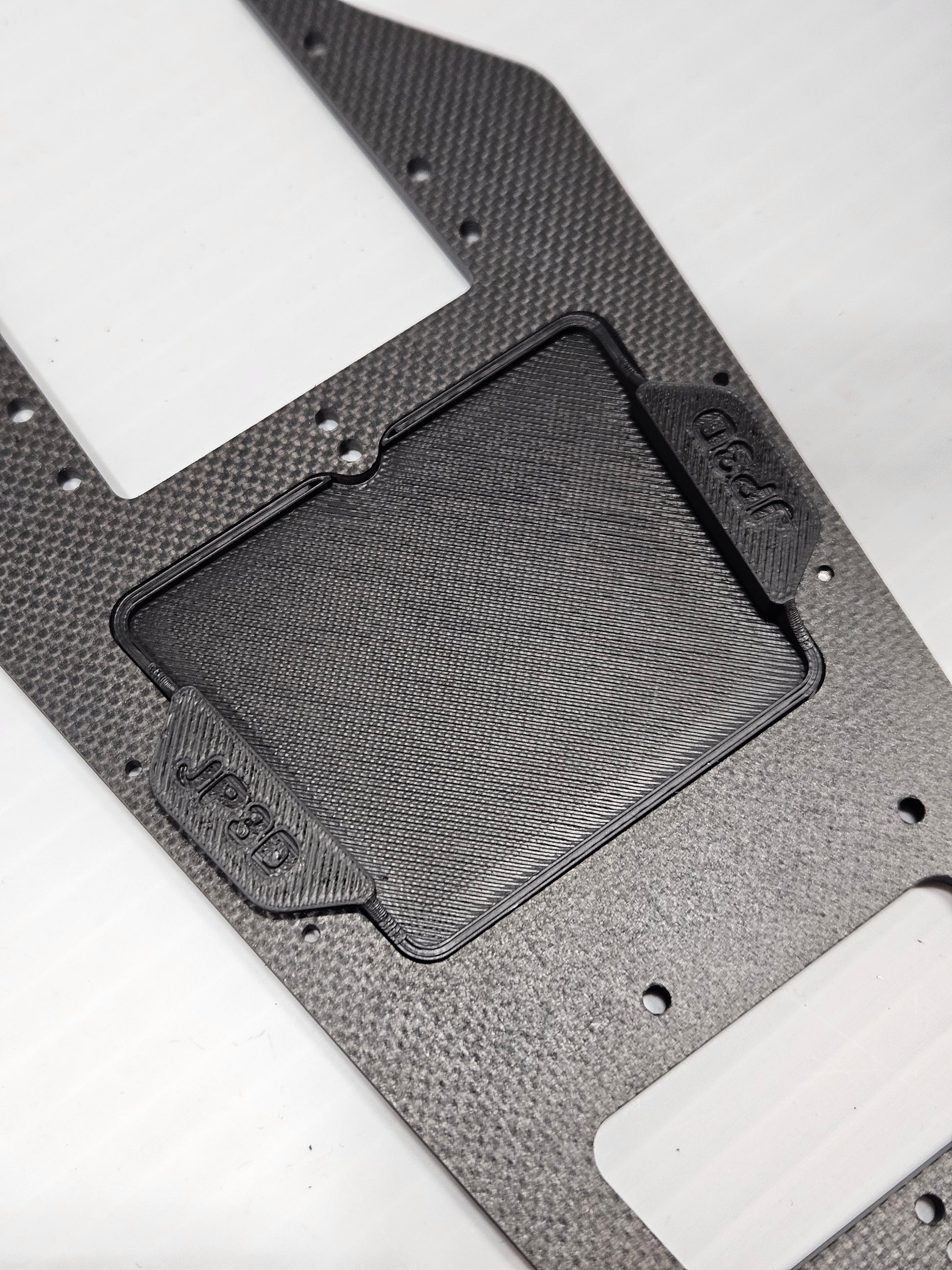 Printed tray to move electronics to upper chassis instead of lower chassis. Mounts in opening in upper chassis. Secured with double-stick tape.